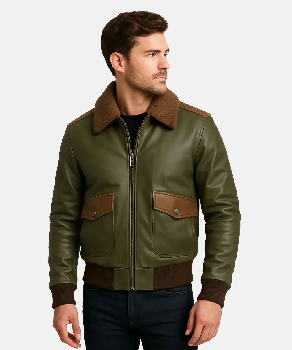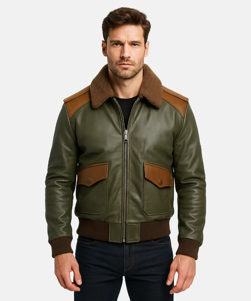 Men’s A2 Bomber Aviator Olive Leather Brown Shearling Jacket